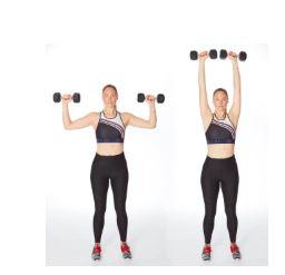 - Stand with feet wide, knees soft, holding a dumbbell with both hands in front of the chest. Engage abs and bring arms overhead, biceps next to ears.
