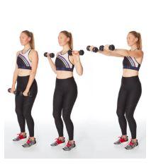 - Raise arms to sides of shoulders, squeezing shoulder blades down and together during the movement (the ends of the weights should face up). Slowly lower arms.