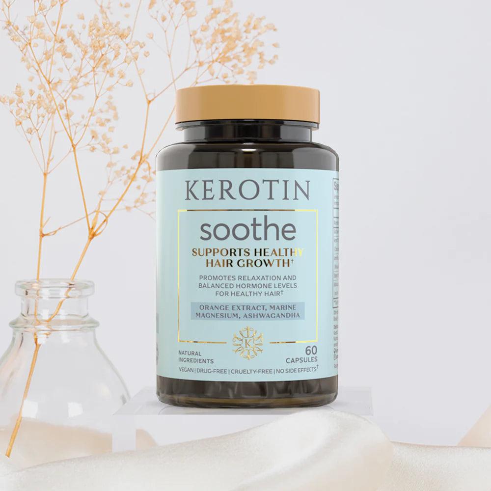Kerotin's soothe formula balances stress hormone levels with natural botanical adaptogens such as Ashwagandha and Sweet Orange Extract, promoting calmness and relaxation while targeting one of the pivotal causes of hair loss- stress.